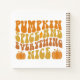 This delightful fall design captures the essence of the season with the phrase "Pumpkin Spice and Everything Nice" presented in a bold, retro-inspired font. The text is arranged in a playful, wavy layout that gives the design a dynamic and energetic feel. Each word is filled with warm autumnal hues, including shades of orange, yellow, and brown, which evoke the cosy and inviting atmosphere of fall. The design is further embellished with charming illustrations of pumpkins and a single autumn leaf, adding a touch of seasonal flair.