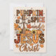 Celebrate the season with this cozy autumn card featuring a rustic wooden cross, white bow, and festive fall accents like pumpkins, sunflowers, and plaid lettering. The bold “Pumpkin Spice and Jesus Christ” message blends faith and seasonal charm, perfect for Thanksgiving or any fall gathering. The reverse side includes a heartfelt Thanksgiving greeting and space to personalize with the sender’s name — a warm way to share gratitude and grace.