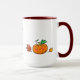 This 15 oz coffee mug with dark red handle and inside features the saying Pumpkin Spice Me!, along with a cute orange jack-o-lantern pumpkin and latté, dressed up with a cosy grey scarf and glasses, and autumn leaves.