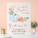 A cute frosted acrylic baby boy shower welcome sign featuring "A Sweet Little Pumpkin Is On his Way" in modern grey typography and a chic script with a heart swash, and watercolors of a blue pumpkin, florals and greenery. Personalise the mother's name and the shower date in simple grey typography.