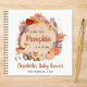 Rustic autumn-themed baby shower guest book featuring a watercolor illustration of a wreath composed of a tree trunk adorned with cute woodland animals (owl, deer, squirrel and fox), fall florals and pumpkins. A "Sweet Little Pumpkin Is On Its Way" is written in a mix of simple typography and a terracotta script. Specify the baby's gender if desired (e.g., "is on his way").