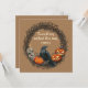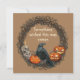 Halloween themed trivet features thorny wreath with raven, skulls and sinister faced jack o' lanterns on brown background and customisable "something wicked this way comes" text in Ravenmore font. Can be used as a Halloween party invite too!