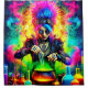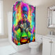 This shower curtain has a punk rocker making a potion pictured on it.