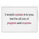 Multiple Products with the humourous comment "I would explain it to you, but I'm all out of puppets and crayons." on them.