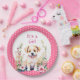 A sweet little puppy dog surrounded by pink flowers watercolor illustration baby shower paper plates.