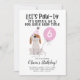 Cute puppy illustration birthday party invitation for your child's birthday! The white and brown dog is wearing a pink and white striped party hat and holding a pink balloon. Inside the balloon is an editable text where you can have the child's age printed. The text above says "Let's Pawty. it's gonna be a dog gone good time." At the bottom there are more customisable text to list the party information including the date and location.This funny party invite is definitely going to be a hit!