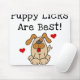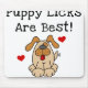A cute brown dog with his little tongue hanging out, red hearts, and black text that reads "Puppy licks are best!".