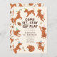 Cute birthday party invitation card featuring hand drawn illustration of puppies playing with party hats. Works for girl or boy birthday party. The text says "come, sit, stay, and play."