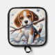 Puppy Playing in the Snow with a Stick in Winter Pot Holder