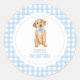 Preppy puppy golden retriever birthday with blue bow and blue plaid.