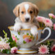 A charming puppy peeks out from a beautifully decorated floral teacup, surrounded by vibrant blooms. The camera performs a gentle zoom-in, capturing the puppy's curious expression and playful demeanor. Soft, diffused lighting enhances the warm colors of the flowers and the puppy's fur, creating a cozy, inviting atmosphere. The scene feels intimate and heartwarming, perfect for showcasing this adorable moment in 4K detail.