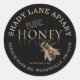 Personalise with your apiary name, location and honey net weight. Common honey net weight conversions: 8oz (227g), 12oz (340g), 16oz (454g), 32oz (907g), 5lb (2.27kg). Black circle with gold text. Life-sized honeybee. May delete the word "pure" and the lines above and below it, or change text to write "RAW" "local" etc.