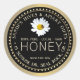 Eye-catching realistic daisy with honeybee. Honey printed in embossed style gold gradient text. Text is written in gold on black background. Gold dotted border.