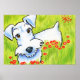 "Pure Schnauzer" depicts a white Schnauzer standing in a field filled with poppy flowers. Ink and coloured pencil illustration by Andie.