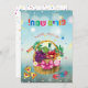 Happy Purim greeting card. Translation from Hebrew: Happy Purim! Purim Jewish Holiday poster with stars of David, traditional Hamantaschen cookies, gragger toy noisemaker, balloons, musicians, masks, Purim basket on festive confetti background. Wish a great Purim celebration. Carnival, Masquerade, Festival, Kids Party, Israel. Invitations & Stationery > Greeting Cards > Holiday & Seasonal Gifts Card. Design with text template. Personalise them by adding name or wishes text. 2023
