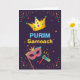 A festive scene with mask, golden crown with jewels, and a grogger noise maker surrounded by confetti are featured on the cover of this Purim Sameach greeting card. Customise the cover text and inside message as you like. Image and verse © Shoaff Ballanger Studios, 2024.