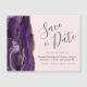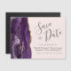 This elegant save the date magnetic card features a purple watercolor agate border trimmed with faux gold glitter. The customisable text combines charcoal grey handwriting script, copperplate and italic fonts on a blush pink background.
