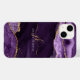 Elegant purple agate, marble and gold glitter cell phone case personalised with a monogram in a chic calligraphy script in gold and name in white. The design is shown on an iPhone 14 and Barely There case style--other phone models and case styles are available on the ordering page. ASSISTANCE: For help with design modification, personalisation, colour change or transferring the design to another product, contact the designer BEFORE ORDERING via the Zazzle Chat MESSAGE tab below or email makeitaboutyoustore@gmail.com.
