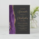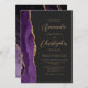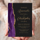 The left-hand edge of this elegant modern wedding invitation features a purple watercolor agate border trimmed with faux gold glitter. The customisable gold-coloured text combines script and sans serif fonts on a slate black background. The reverse side features a matching purple and gold agate design.