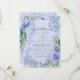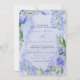 Design features a printed coloured with floral element in shades of purple and dusty blue over greenery leaves branch wreath and peony tulip hyacinths flowers on a light lilac light blue watercolor background.. Great for your wedding celebrations!