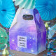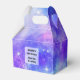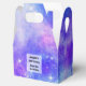 Tiny favour box with a cosmic abstract background. Swirling vibrant colours of light blue, pink and purple. White stars scattered around.