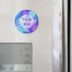 Magnet with a cosmic abstract background. Swirling vibrant colours of light blue, pink and purple. White stars scattered around.