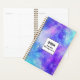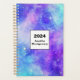 Spiral planner with a cosmic abstract background. Swirling vibrant colours of light blue, pink and purple. White stars scattered around.
