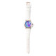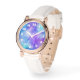 A watch with a cosmic abstract background. Swirling vibrant colours of light blue, pink and purple. White stars scattered around.