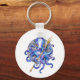 a traditional watercolor design of a blue and purple coloured octopus, kraken or squid holding a golden trident in its tentacles on a keychain.