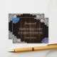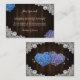 Announce the postponement of your wedding with this purple and blue announcement card featuring purple and blue hydrangea flowers on a rustic wood background adorned with white floral lace.