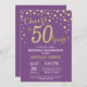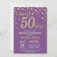 50th Birthday Invitation with Purple and Gold Glitter Diamond Background. Gold Confetti. Adult Birthday. Male Men or Women Birthday. For further customisation, please click the "Customise it" button and use our design tool to modify this template.