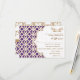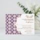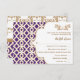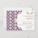 Elegant, stylish and beautiful french Moroccan tile inspired wedding response cards with a repeating purple hue and gold geometric pattern design and gold hued floral flourishes. This upscale and luxe RSVP card is perfect for a Moroccan, Arabian Nights or Aladdin themed wedding. The back of these custom, fancy frame cards can be personalised with the names of the bride and groom on the printed ribbon look design. Artwork and design © Chrissy H. Studios, LLC. All Rights Reserved.