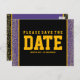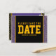 Purple and gold save the date postcard with a sport look. You can easily customise these fun purple and gold save the date postcards for your event by simply adding your details in the font style, colour and wording of your choice. This is a printed design with no real glitter.