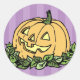 Happy Halloween stickers in fun purple stripe pattern with cute orange pumpkin illustration. Perfect for kids, at school, or on Halloween party invitation envelopes as a seal.