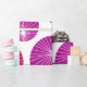 This wrapping paper has a mid-century modern design of purple and pink circles with white starbursts in them, all on a field of white.