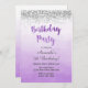 Birthday invitation with silver glitter look design and ombre purple watercolor background.
