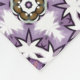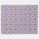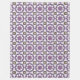 Towel set with a purple and white geometric floral pattern hanging on a rod. Below, a washcloth shows the same design with a folded corner.