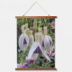 Decorate your living space with this vertical, hanging wall tapestry with wooden tops that features a photo image of hanging, purple Fuchsia flowers with white sepals. A lovely, floral design!