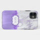 Chic iPhone case done in a white and purple marbled look, across the top and a purple foil look, across the bottom of the case. A white with purple glittery framed text area, has purple text ready to personalise, to suit your needs.