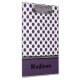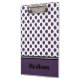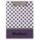 Personalised purple and white polka dot clipboard. The back of this clipboard is purple and white striped.