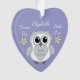 A little hanging heart decoration / ornament, designed in purple and yellow, with a cute grey owl and yellow flowers, for a new baby girl. Just add her name.