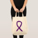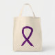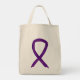 The tote bag features purple awareness ribbon art. A purple awareness ribbon colour means support for Pancreatic Cancer, Crohn's Disease and Colitis, Alzheimer's Disease, Anti-Gay Bullying (Spirit Day), Cancer Survivor (All Kinds), Domestic Violence, Lupus, Sjögren's Syndrome, Chronic Pain, Leiomyosarcoma, Arnold-Chiari Malformation, Migraines, Cystic Fibrosis, Retinitis Pigmentosa, and Fibromyalgia. Let this purple awareness ribbon support these causes!