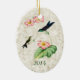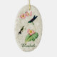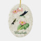 Ceramic ornament features a vintage illustration of the Purple-backed Thornbill hummingbird (Ramphomicron microrhynchum.) An adult hummingbird with a dark purple back and metallic green throat, and a baby bird with speckled throat perch on a begonia plant with pink flowers, with a light gold marble texture background. Personalisation options on front and back, or remove text for an elegant nature-inspired addition to any Christmas tree. Perfect all occasion gift for hummingbird lovers.