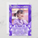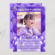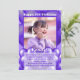 Child's birthday party invitation with purple balloons design and a place for her photo. Fun, printed white text says, "Happy Birthday" at the top. Her name is in large print beneath the photo template. All party information is in a paragraph beneath the photo. The back of the invitation contains more balloons in a small pattern. This design is also available as an instant download and can be shared online.