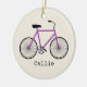 An ornament featuring an illustration of a purple bicycle. Personalise with your name under bike.
