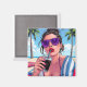 Cute beachy pop paper magnet. A cute comic book style cartoon illustration of a woman drinking a soda at the beach in purple sunglasses, bandanna and bikini.