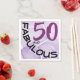 This birthday napkin features a "50 and fabulous" typography design. The number 50, in purple, dominates the top right of the design while fabulous, in black, arches from the top left to the bottom right. The design can be used for a birthday or anniversary celebration.