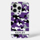 Customize this purple, black, gray and white camouflage iPhone 15 pro case with your name in a trendy modern CAP font in black on white. It's so modern, girly and trendy! Perfect for any country girl!