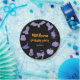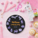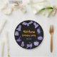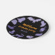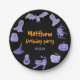 Purple, orange and black Birthday party paper plate with illustrated Halloween motifs. Customise the name, date and other text as you wish.