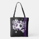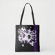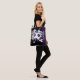 This cool soccer themed tote bag features an "explosion" of purple, black and white soccer balls in varying sizes and grey and purple star shapes - the purple star has a tiny pattern of white polka dots - customise with the her name orientated vertically on purple varsity stripes on the right edge, front and back - black background is customisable - by katz_d_zynes